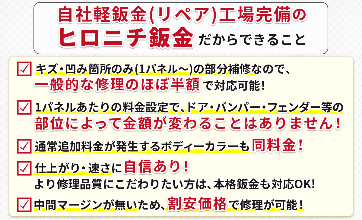 広島エリアのお客様のご要望に合せてキズ直し、鈑金・修理のお支払い方法をお選び頂けます。